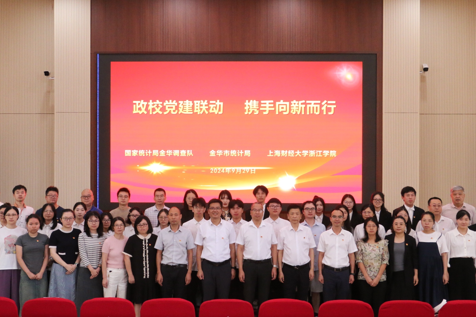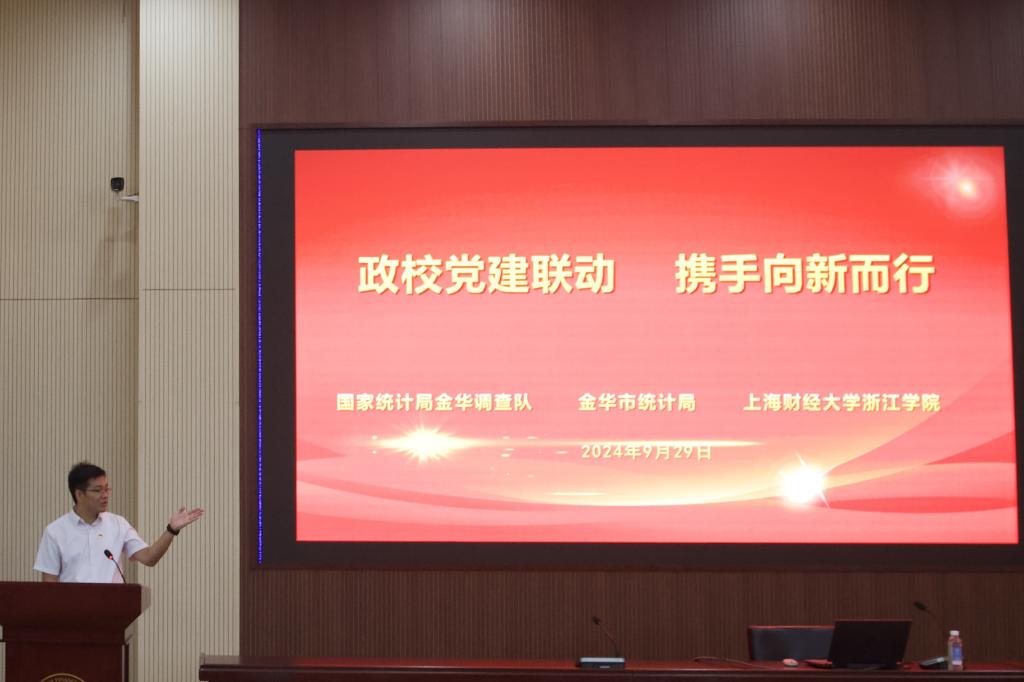 9月29日,学院统计系联合国家统计局金华调查队、金华市统计局,在学院120报告厅开展了“政校党建联动 携手向新而行”主题党日活动。此次活动不仅是一次党建联建的重要实践,也是对前期政校党建联建成果的精彩展示和深化拓展,更是学院积极推进“一融双高”建设与统计系践行“双学双融”发展理念的生动实践。活动中,还举行了新生“开学第一课”系列活动启动仪式。市调查队党组成员、副队长张国民、楼涛及纪检组长徐玉飞,市统计局党组成员、社会经济调查队队长赵奇峰,上海财经大学教务处副处长吴纯杰,以及学院党委副书记何志强、学院党委委员、组织部部长张正亮等出席活动。此外,来自市调查队和市统计局的党员、干部代表,以及雷火网页版登录入口_雷火(中国)全体新生和师生党员等共计200余人也参与了此次主题党日活动。